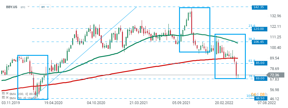 انخفض سهم Best Buy (BBY.US) بأكثر من 50،0٪ من أعلى مستوى له على الإطلاق عند 142.35 دولارًا ويقترب من الدعم الرئيسي عند 69.00 دولارًا ، والذي يتزامن مع تصحيح فيبوناتشي 78.6٪ للموجة الصعودية التي تم إطلاقها في شهر مارس 2020 والحد الأدنى من 1: 1 هيكل. اما في حالة حدوث الاختراق إلى مستوى أدنى ، فقد تتسارع الحركة الهبوطية نحو قيعان الوباء حول 48.50 دولارًا أمريكيًا. المصدر: xStation5