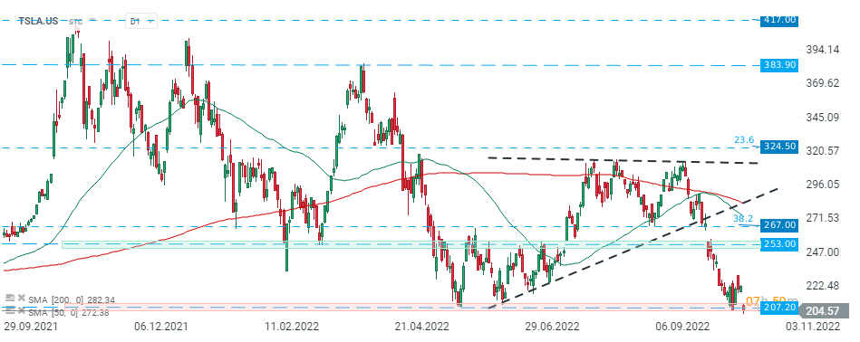 يختبر سعر سهم Tesla (TSLA.US) مرة أخرى أوزون الدعم الرئيسي بحوالي 207.20 دولارًا. المصدر: xStation5