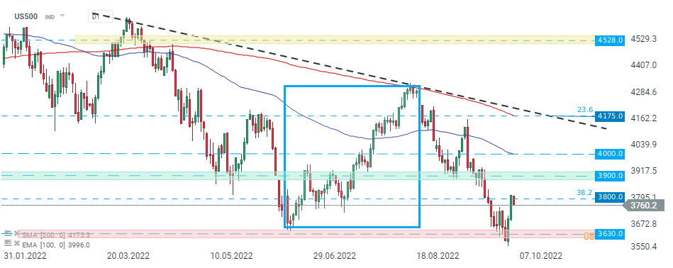 تراجع US500 بعد أن فشل المشترون في اختراق المقاومة الرئيسية عند 3800 نقطة ، والتي تتميز بردود فعل أسعار سابقة و 38.2٪ تصحيح فيبوناتشي للموجة الصعودية التي تم إطلاقها في مارس 2020. إذا تمكن البائعون من الحفاظ على السيطرة ، فعندئذ يكون هناك اندفاع هبوطي آخر نحو أدنى المستويات الأخيرة عند 3630 نقطة. من ناحية أخرى ، في حالة حدوث كسر فوق المقاومة المذكورة أعلاه ، قد تتسارع الحركة الصعودية نحو المقاومة التالية عند 3900 نقطة. المصدر: xStation5