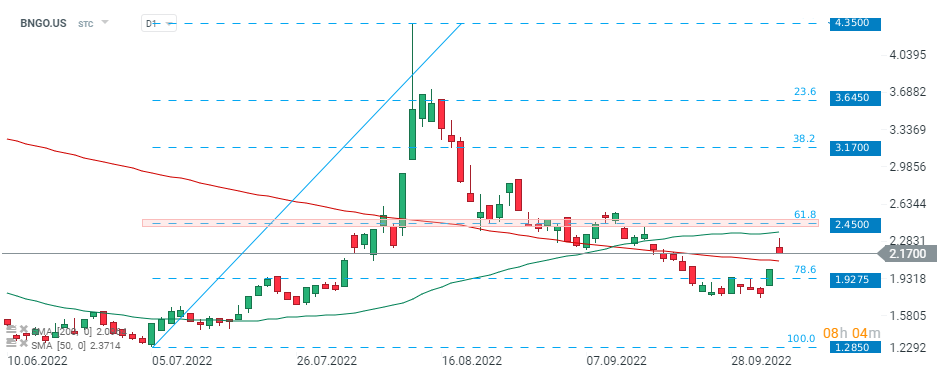 أطلق سهم Bionano Genomics (BNGO.US) جلسة اليوم بفجوة سعرية صعودية ويقترب من المقاومة الرئيسية حول 2.45 دولار ، والتي تتزامن مع 61.8٪ فيبوناتشي للموجة الصعودية الأخيرة. المصدر: xStation5