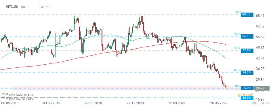 انخفض سهم Intel (INTC.US) بأكثر من 60.0٪ من أعلى مستوى له في عام 2020 عند 69.45 دولارًا ويختبر حاليًا الدعم الرئيسي عند 25.00 دولارًا ، والذي يتزامن مع تصحيح فيبوناتشي 78.6٪ للحركة الصعودية التي تم إطلاقها في عام 2008. في حالة حدوث كسر منخفض ، فإن الهدف التالي لـ يقع البائعون حول أدنى مستويات عام 2012 عند 19.00 دولارًا. المصدر: xStation5
