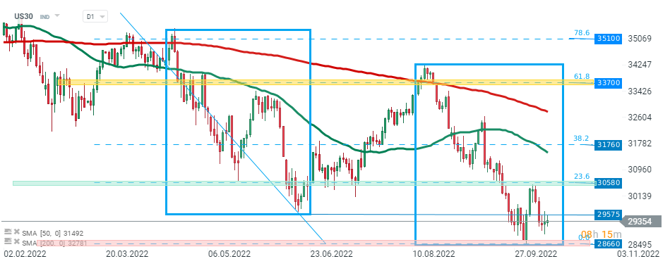 محى US30 بعض المكاسب المبكرة حيث فشل المشترون في اختراق المقاومة المحلية عند 29757 نقطة. وطالما ظل المؤشر في الأسفل ، فقد تتعمق الحركة الهبوطية نحو القيعان الأخيرة عند 28660 نقطة ، والتي تم تحديدها بالحد الأدنى للهيكل المحلي 1: 1. المصدر: xStation5