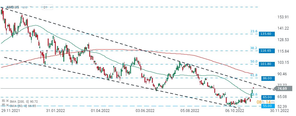 يتحرك سهم AMD (AMD.US) في اتجاه هبوطي حاد في الأشهر الأخيرة حيث أخافت مخاوف الركود المستثمرين من قطاع التكنولوجيا. مع ذلك ، وجد المشترون بعض الدعم حول مستوى 55.00 دولار وأطلقوا حركة انتعاش. يسود الشعور المتفائل اليوم ويتجه السهم نحو الحد الأعلى لتشكيل الوتد الذي يجب أن يكون بمثابة خط المقاومة الأول. المصدر: xStation5