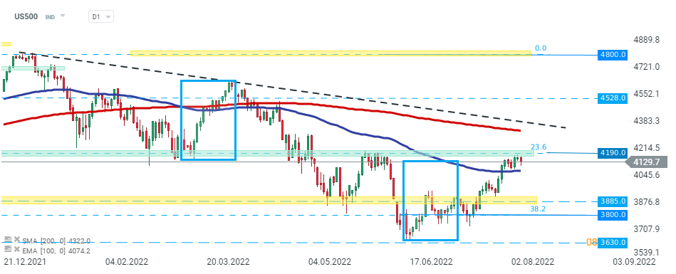 ألقى تقرير التوظيف الأمريكي المتفائل بثقله على معنويات السوق وفشل US500 في اختراق المقاومة الرئيسية عند مستويات 4190 نقطة والتي تم تحديدها بالحد الأعلى لهيكل 1: 1 وردود فعل الأسعار السابقة و 23.6٪ هو تصحيح فيبوناتشي للموجة الصعودية التي تم إطلاقها في مارس 2020. طالما يقع المؤشر أدناه ، قد ينطلق دافع هبوطي آخر نحو الدعم عند مستويات 3885 نقطة.