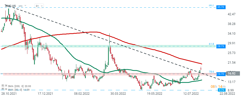 أطلق سهم AMC Entertainment (AMCUS) جلسة اليوم هبوطيًا ويتجه نحو دعم رئيسي عند 16.70 دولارًا ، والذي يتزامن مع تصحيح فيبوناتشي 78.6٪ للموجة الصعودية التي بدأت في بداية هوس سهم meme في يناير 2021. المصدر: xStation5