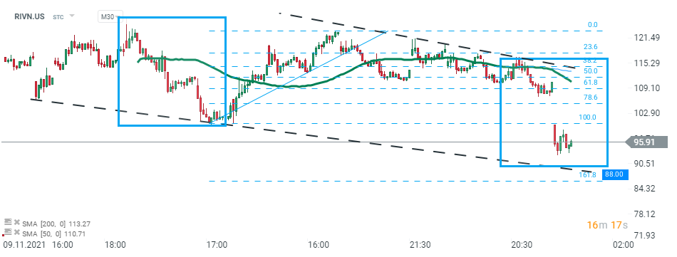 Rivian (RIVN.US) stock price dropped to the lowest level since IPO during today’s session. If current sentiment prevails, a downward move may accelerate towards support at $88.00 which is marked with a lower limit of the 1:1 structure and lower boundary of the wedge formation. Source:xStation5
