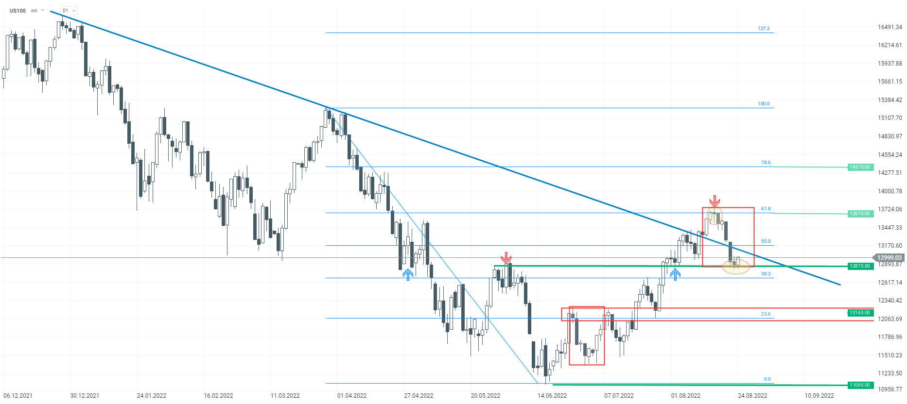 كما عانت المؤشرات الأمريكية في الأيام الأخيرة. مع ذلك ، تجلب جلسة الأمس واليوم أيضًا تباطؤًا في الانخفاضات. بالنظر من الناحية الفنية إلى المؤشر التكنولوجي (US100) في الفاصل الزمني D1 ، نلاحظ رد فعل عند ذروة دعم رئيسي قصير المدى - 12875 نقطة. يُشتق هذا المستوى من الحد الأدنى لنظام 1: 1 ، بالإضافة إلى تفاعلات الأسعار السابقة. إذا نجح المشترون في التوقف عن المزيد من الخصم ، فلن يكون من المستحيل توليد موجة صعودية أخرى. من ناحية أخرى ، قد يؤدي كسر السعر إلى ما دون 12875 نقطة إلى تمهيد الطريق نحو منطقة الدعم عند 12165 نقطة.