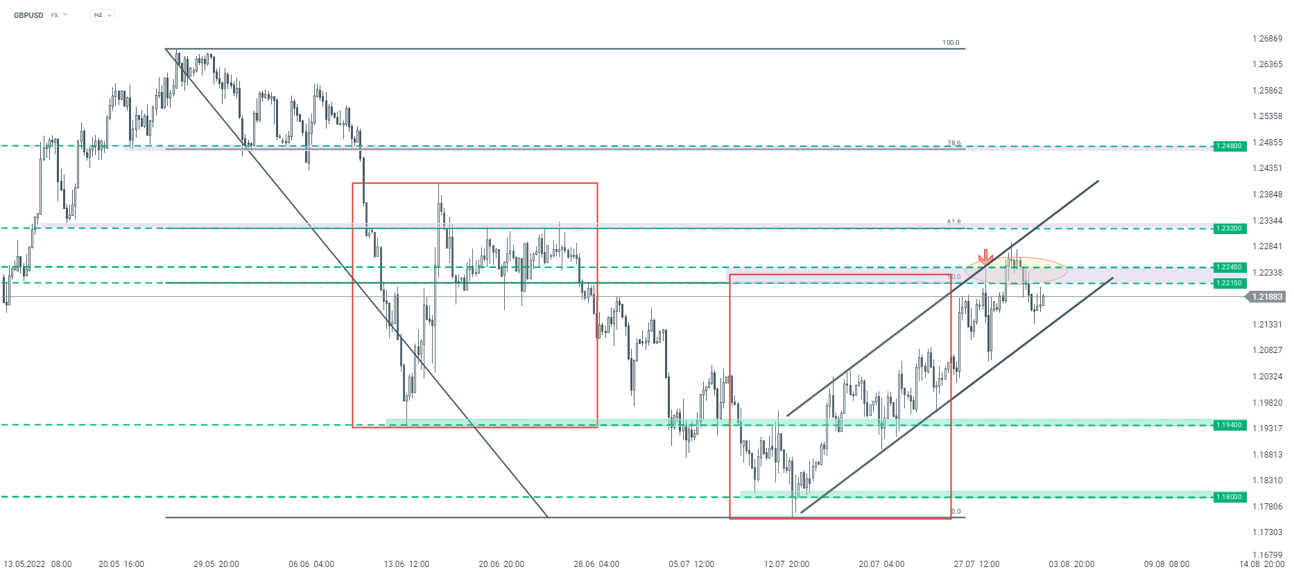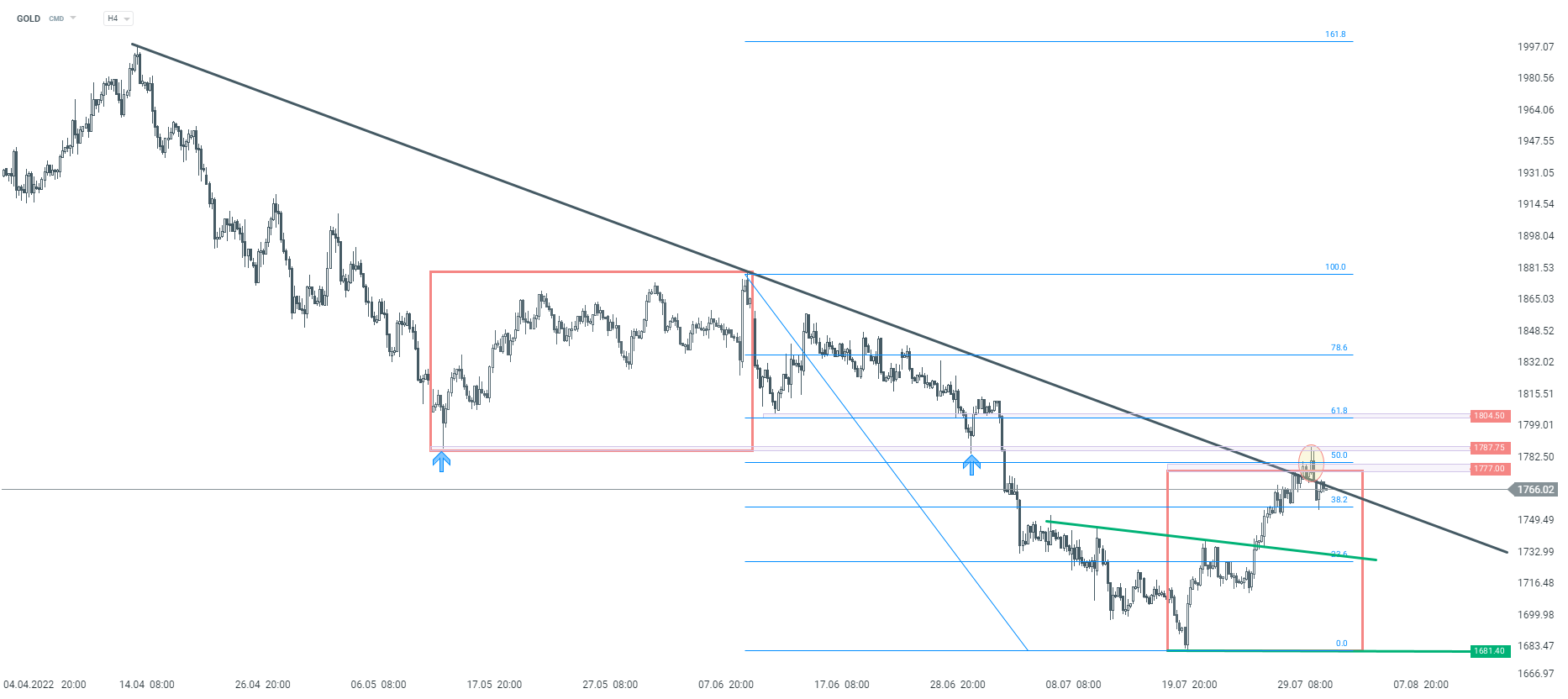 بعد ذلك ، دعنا نلقي نظرة على الوضع في سوق الذهب. بإلقاء نظرة على الفاصل الزمني H4 ، يمكننا أن نرى أن الزوج كان يتداول في اتجاه هبوطي لبعض الوقت بالفعل. على الرغم من رسم نموذج معكوس للرأس والكتفين (الخط الأخضر على الرسم البياني يشير إلى خط العنق) ، فقد توقف التصحيح الصعودي عند المقاومة عند 1،777 دولارًا - قبل وقت طويل من هدف نموذج SHS المعكوس المحتمل. و تم تحديد منطقة 1،777 دولارًا بنسبة تصحيح 50 ٪ من الدافع الهبوطي الذي تم إطلاقه في يونيو بالإضافة إلى الحد الأعلى لهيكل Overbalance. وفقًا لمنهجية Overbalance ، قد يكون الاتجاه الهبوطي على وشك الاستئناف. في مثل هذا السيناريو ، قد يكون خط العنق المذكور أعلاه لنموذج SHS المعكوس بمثابة الدعم الأول.