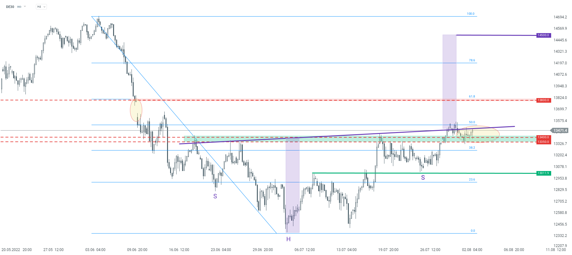 أخيرًا وليس آخرًا ، دعنا نلقي نظرة على مؤشر DAX الألماني (DE30). بإلقاء نظرة على DE30 عند الفاصل الزمني H4 ، يمكننا أن نرى أن نموذج الرأس والكتف معكوس عريض ظهر على الرسم البياني. مع ذلك ، فقدت الحركة الصعودية الزخم بعد الاختراق فوق خط العنق للنموذج وبدأ التصحيح الهبوطي. يبدو أن منطقة السعر 13،350-13،450 نقطة هي المفتاح الآن. إذا تمكن المؤشر من البقاء فوقه ، فيمكن إطلاق حركة صعودية نحو النطاق المحتمل لنموذج SHS المعكوس. من ناحية أخرى ، فإن الاختراق دون ذلك من شأنه أن يضيء توقعات المضاربين على الارتفاع وقد يتبعه اختبار دعم عند 13،011 نقطة.