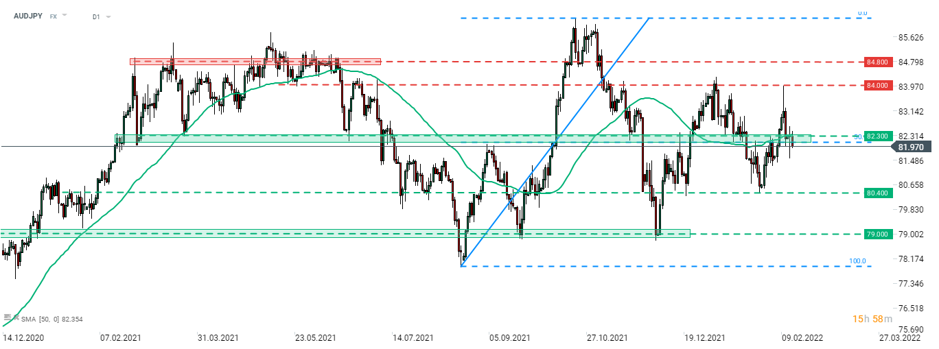اختبر الدولار الأسترالي مقابل الين الياباني مستوى 84.00 الأسبوع الماضي ولكنه شهد لاحقًا انعكاسًا هائلًا مع تزايد مخاوف الحرب. يقوم الزوج حاليًا باختراق ما دون المقبض 82.00 ، والذي يعمل بمثابة حد أدنى لمنطقة الدعم ويتم تمييزه باسترداد بنسبة 50٪ للحركة الصعودية للربع الثالث والربع الرابع من عام 2021. المصدر: xStation