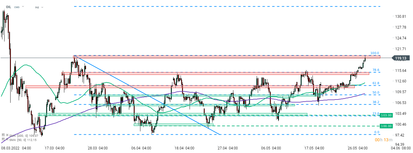 قفز النفط بعد اتفاق أعضاء الاتحاد الأوروبي على حظر النفط الروسي. يتم تداول خام برنت (النفط) أعلى بنسبة 1٪ ويختبر منطقة المقاومة المميزة بأعلى مستوى في أواخر مارس في 119-120 دولارًا للبرميل. المصدر: xStation5