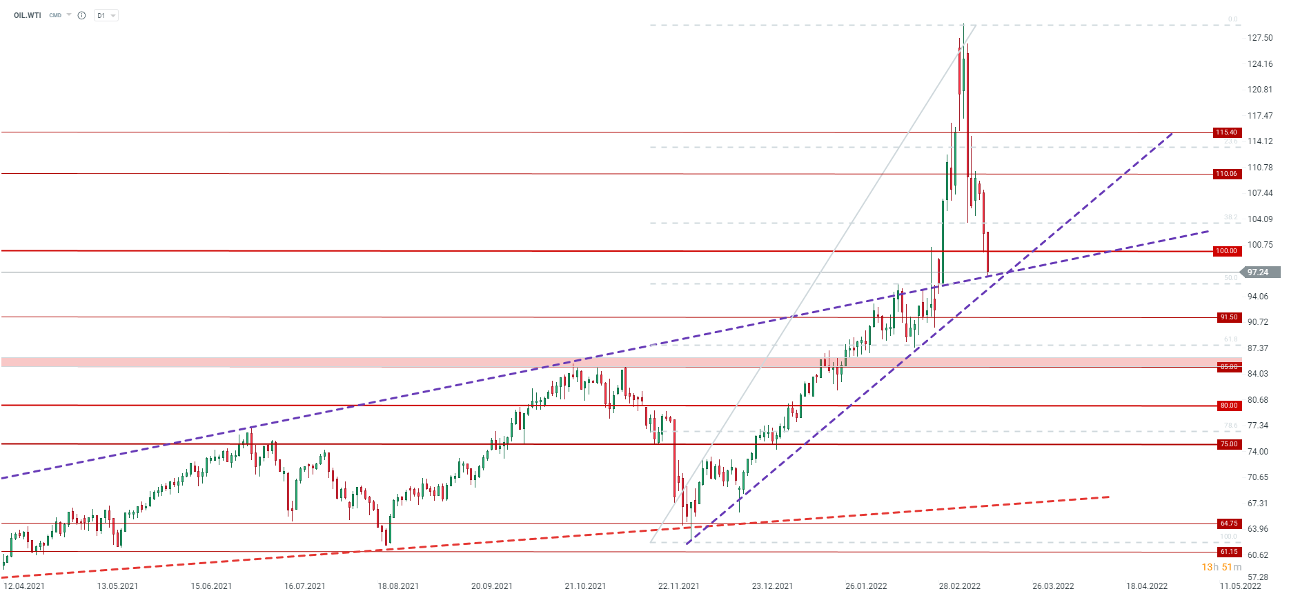 يتم تداول النفط الخام حول 96-97 دولارًا للبرميل. هذه منطقة دعم رئيسية ، تتميز بارتداد فيبوناتشي بنسبة 50.0٪ لآخر موجة دافعة صعودية وخطين من خطوط الاتجاه الصعودي. المصدر: xStation5