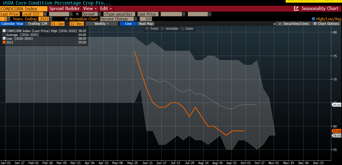 The quality of corn crops has been relatively low within the last 5 years. In theory, the weather could make this season as bad as last year. Source: Bloomberg