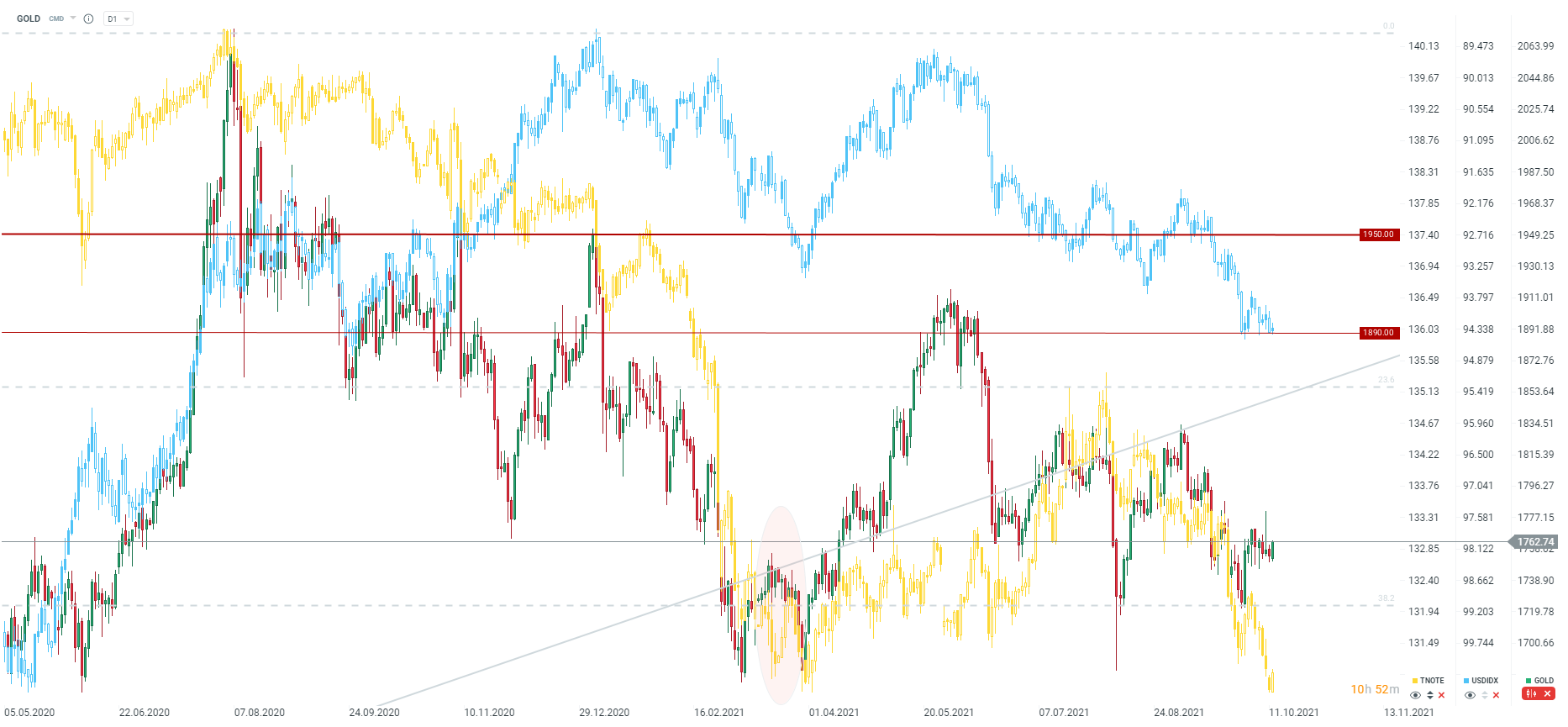 We can currently observe a very large divergence of TNOTE and gold prices. A similar difference was noticeable in March. Source: xStation5