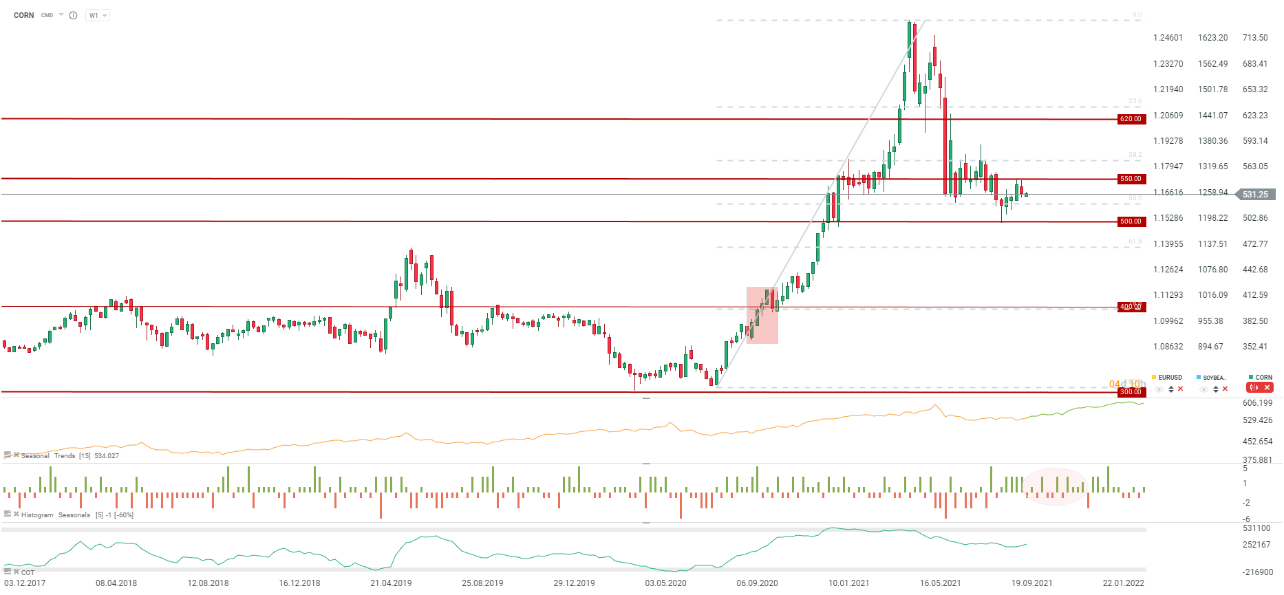 - The price remains in a narrow range of 500-550 cents per bushel - only a decisive break any of these level could lead to bigger price movements
