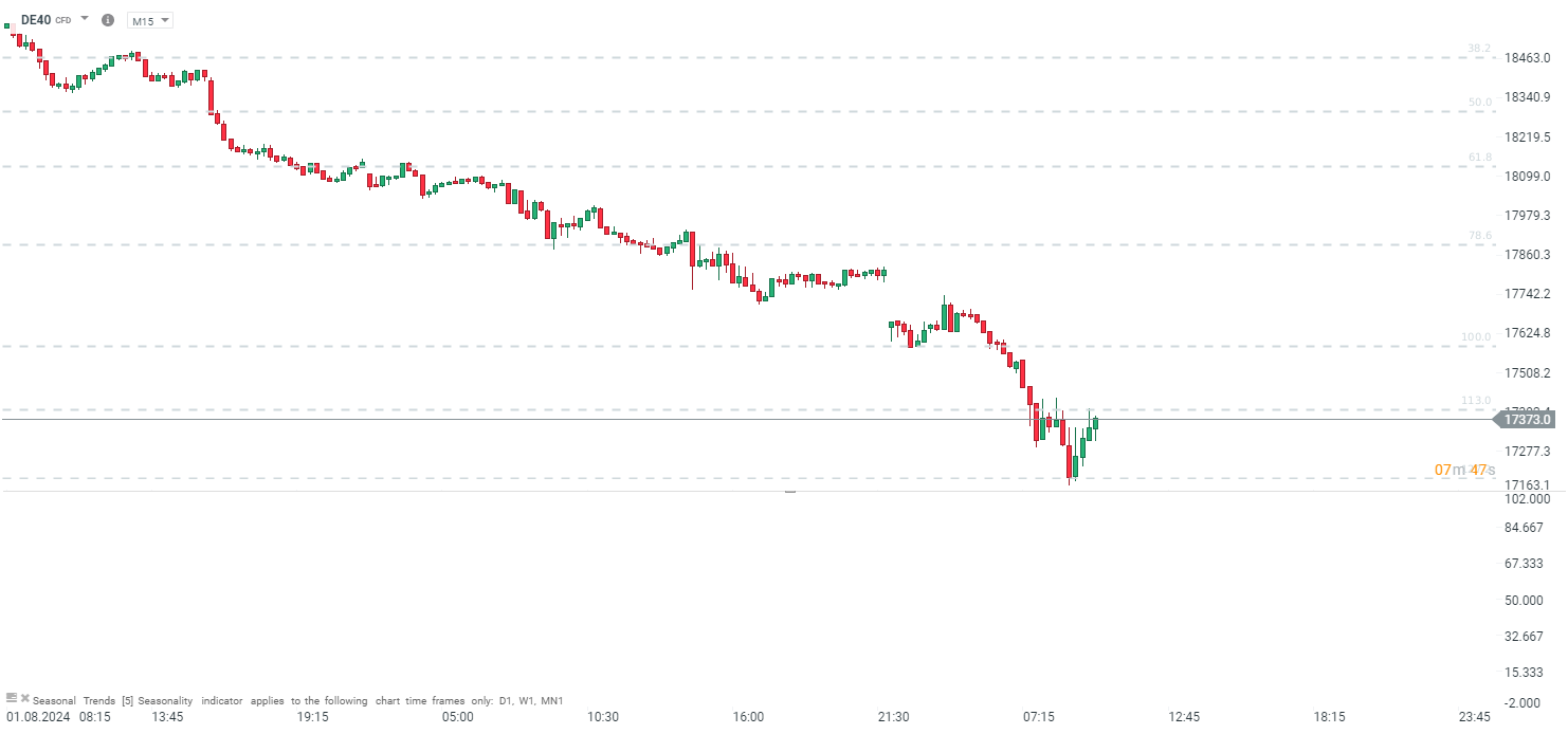 تقدم مؤشرات مديري المشتريات لقطاع الخدمات في منطقة اليورو صورة مختلطة. فمن ناحية، نرى خيبة أمل كبيرة من إسبانيا، وانخفاضًا في فرنسا مقارنة بالقراءة الأولية، وقراءة أقل بكثير في إيطاليا ومن ناحية أخرى، هناك تحسن في ألمانيا مقارنة بالقراءة الأولية، مما أدى إلى ثبات مؤشر منطقة اليورو الإجمالي كما هو متوقع ومع ذلك، تجدر الإشارة إلى أن مؤشرات مديري المشتريات لقطاع الخدمات تؤدي بشكل أسوأ قليلاً مما كانت عليه في يونيو، على الرغم من أنها لا تزال فوق علامة 50 نقطة ويحافظ المؤشر المركب لمنطقة اليورو على موقف أعلى من 50 نقطة، على الرغم من أن معظم المؤشرات الصناعية في أكبر الاقتصادات أقل من 50 نقطة وعلاوة على ذلك، يمكننا أن نرى أن المنشورات الأخيرة إيجابية لسوق الأوراق المالية ويمحو مؤشر DE40 بعض الانخفاضات من الساعة الأولى من الجلسة: