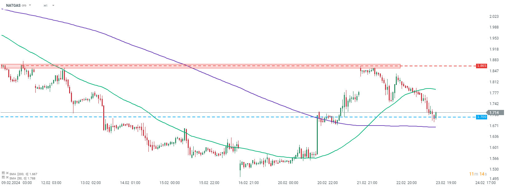 استأنفت NATGAS انخفاضاتها بعد تمديد العقد يوم أمس وانخفضت إلى 1.70 دولارًا أمريكيًا لكل مليون وحدة حرارية بريطانية. المصدر: اكس ستيشن 5