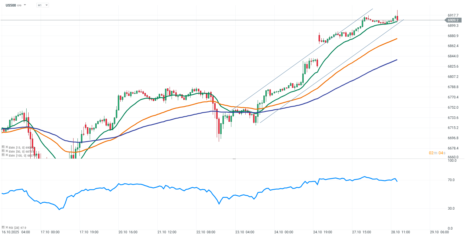 في الأيام المقبلة، سينصب اهتمام المستثمرين على شركات Mag7 المتبقية - آبل، ومايكروسوفت، وأمازون، وألفابت، وميتا. تؤثر نتائج هذه الشركات بشكل كبير على مؤشرات الأسهم، وتعكس إلى حد كبير الأداء العام لقطاعي التكنولوجيا والابتكار. قد تدعم المفاجآت الإيجابية في هذا القطاع المستويات القياسية لمؤشري ستاندرد آند بورز 500 وناسداك 100، في حين أن النتائج الضعيفة قد تزيد من انتقائية السوق وتُحدث تصحيحات في تقييمات الشركات الأكثر حساسية للدورات الاقتصادية. في الوقت نفسه، يراقب المستثمرون عن كثب قرار الاحتياطي الفيدرالي، وهو عامل رئيسي يؤثر على معنويات السوق. يشير التسعير الحالي إلى خفض أسعار الفائدة بنحو 25 نقطة أساس، مما يُثير تفاؤلاً حذراً، لا سيما في قطاع التكنولوجيا والشركات المعتمدة على تمويل النمو. من ناحية أخرى، فإن أي إشارة إلى الحفاظ على سياسة نقدية تقييدية أو استمرار الضغوط التضخمية قد تؤدي إلى تصحيحات وزيادة الانتقائية في الاستثمارات.