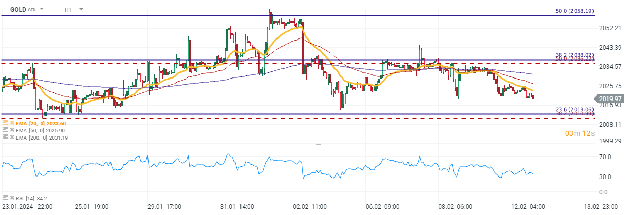تراجع التوقعات لتخفيضات مبكرة في أسعار الفائدة من قبل الاحتياطي الفيدرالي أدى إلى انخفاض الذهب مرة أخرى إلى نطاق تداول بين 2000 دولار و2050 دولار في فبراير. حيث بدأت الأسواق في تسعير فرص تخفيض أسعار الفائدة بشكل مستقر في مارس ومايو.
