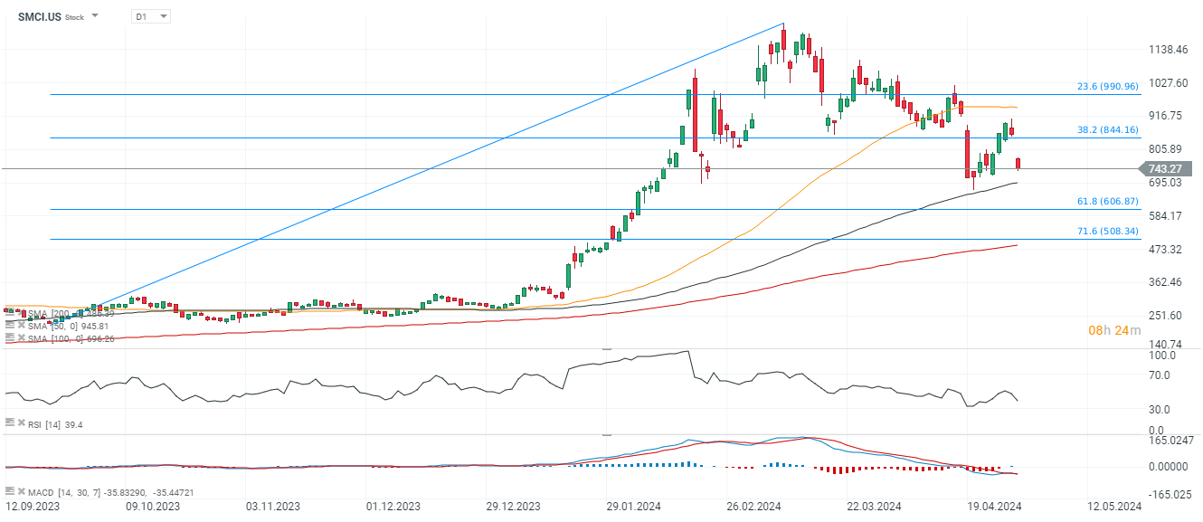 Super Micro Computer (SMCI.US) – خسرت الأسهم ما يقرب من 14٪ اليوم، حيث أشارت النتائج الفصلية إلى ارتفاع الأسهم وخيبة الأمل من حيث الإيرادات (على الرغم من ارتفاعها بنسبة 200٪ على أساس سنوي). حلت الشركة، المرتبطة باتجاه الذكاء الاصطناعي، محل Whirlpool في مؤشر S&P 500 والنمو الهائل لسهمها جعلها واحدة من المعايير الرئيسية لقوة سوق الذكاء الاصطناعي الصاعد. لم يكن السهم مدعومًا حتى بتوجيهاته الأعلى بشكل حاد من المتوقع للربع الحالي.