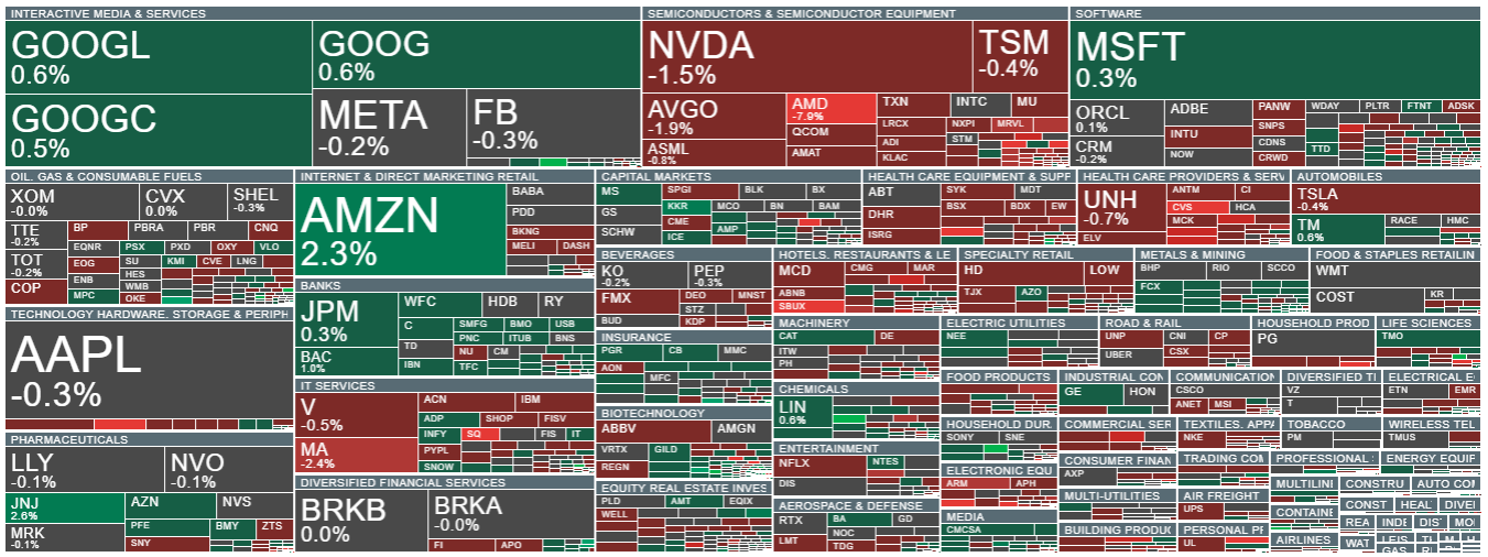 النسبة المئوية للتغيرات في أسهم S&P 500. قطاعات أشباه الموصلات والتأمين والخدمات الصحية وتكنولوجيا المعلومات تخسر. وانخفضت أسهم Block (SQ.US) بأكثر من 6٪. المصدر: اكس ستيشن 5