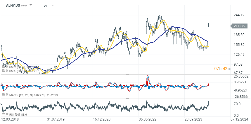 حققت شركة Alnylam Pharmaceuticals (ALNY.US) مكاسب بنسبة 28% بعد نجاح نتائج المرحلة الأخيرة من التجارب لعقار vutrisiran، وهو علاج للداء النشواني ATTR المصاحب لاعتلال عضلة القلب. حققت التجربة نتائجها الأولية والثانوية، وحققت تخفيضات كبيرة في الوفيات المركبة لجميع الأسباب وأحداث القلب والأوعية الدموية المتكررة، بالإضافة إلى انخفاض ملحوظ في الوفيات في نقاط النهاية الثانوية المحددة مسبقًا.