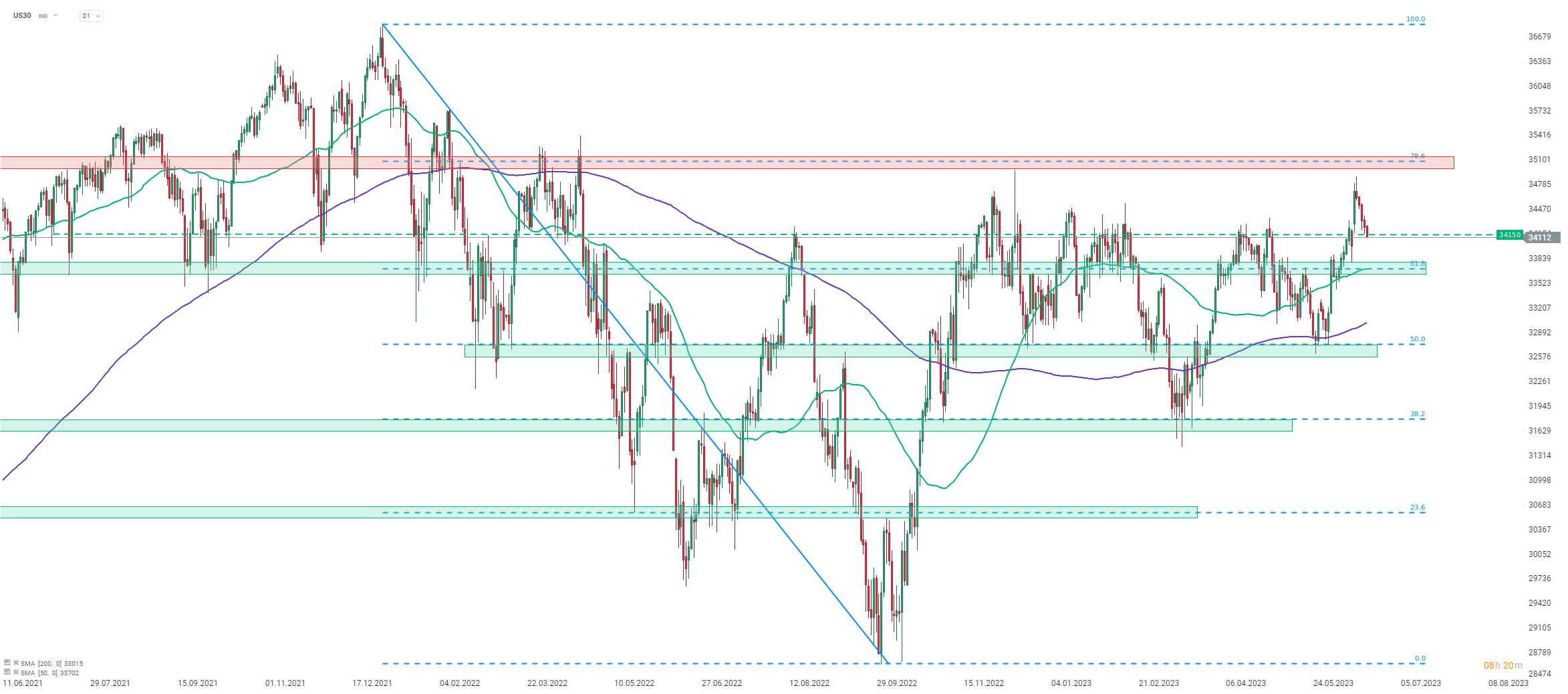 يواصل مؤشر Dow Jones (US30) تراجعه الذي بدأ مؤخرًا. فشل المؤشر في الوصول إلى منطقة 35000 نقطة وبدأ في التراجع في نهاية الأسبوع السابق. بإلقاء نظرة على US30 عند الفاصل الزمني D1 ، يمكننا أن نرى أن المؤشر يختبر حاليًا منطقة تأرجح 34،150 نقطة ، مميزة بأعلى المستويات المحلية السابقة. إذا رأينا اختراقًا أدناه ، فقد تتعمق الانخفاضات مع اختبار منطقة الدعم التي تم تحديدها مع تصحيح 61.8٪ للحركة الهبوطية التي تم إطلاقها في بداية عام 2022 كهدف محتمل.