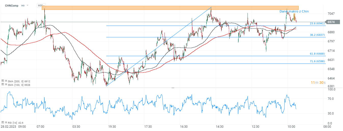 مخطط CHNComp ، فاصل M30. وهذه هي المرة الثالثة منذ بداية مارس التي يتفاعل فيها المؤشر مع عرض يزيد عن 7000 نقطة. المستويات الرئيسية التي يجب مراقبتها في الوقت الحالي هي SMA100 و SMA200 و 23.6 و 38.2 فيبوناتشي التي تدعمها ردود فعل الأسعار السابقة. المصدر: xStation5
