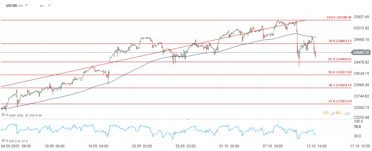 يواجه مؤشر ناسداك 100 (US100) موجة ضغط بيعي واضحة، إذ فقد زخمه الصعودي واختبر مؤخرًا مستويات دعم فنية رئيسية بعد كسر اتجاهه الصاعد الذي بدأ منذ منتصف أغسطس. ويتزامن هذا التصحيح مع بداية موسم الأرباح في وول ستريت واستمرار حالة الغموض بشأن السياسة النقدية الأمريكية وسط الإغلاق الحكومي.