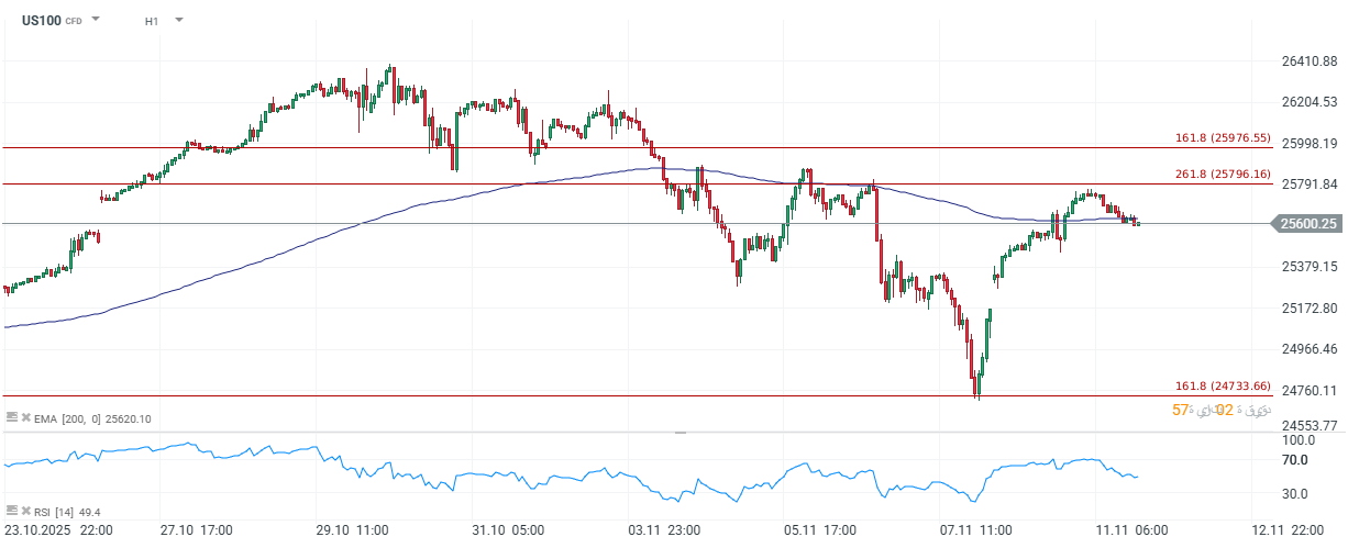 شهد مؤشر US100 (ناسداك 100) ارتدادًا جزئيًا بعد التراجع الحاد الذي شهده منذ نهاية أكتوبر، إلا أن الزخم الحالي يبدو أنه يتباطأ بالقرب من مناطق مقاومة رئيسية. يتداول المؤشر حاليًا حول مستوى 25,700، أسفل المتوسط المتحرك الأساسي لـ 200 ساعة عند 25,620 تقريبًا، مما يشير إلى أن الاتجاه متوسط المدى لا يزال هشًا.
