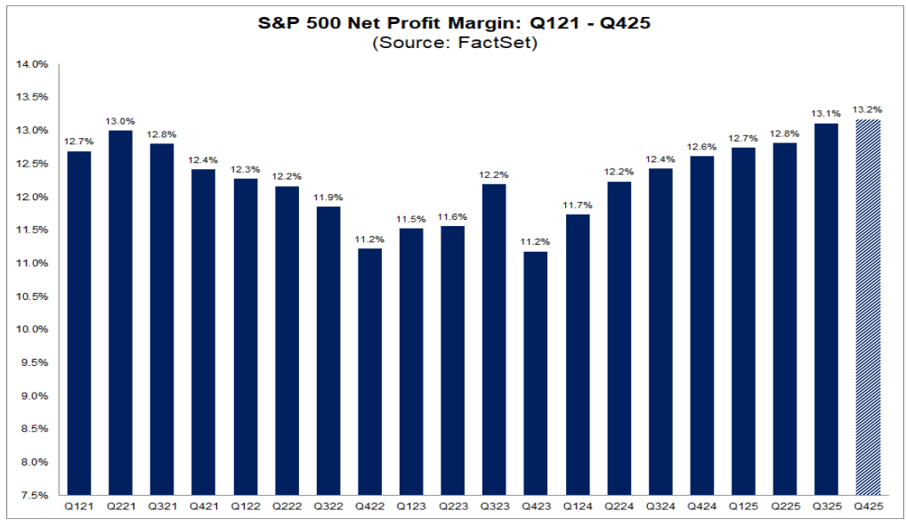يُعدّ الربح العنصر الأكثر إثارة للإعجاب حتى الآن. فعلى الرغم من النقاشات الدائرة حول الرسوم الجمركية، وتكاليف العمالة، والخدمات اللوجستية، وضغوط الأسعار، يُشير مؤشر ستاندرد آند بورز 500 حاليًا إلى هامش ربح صافي مُجمّع بنسبة 13.2% للربع الرابع.