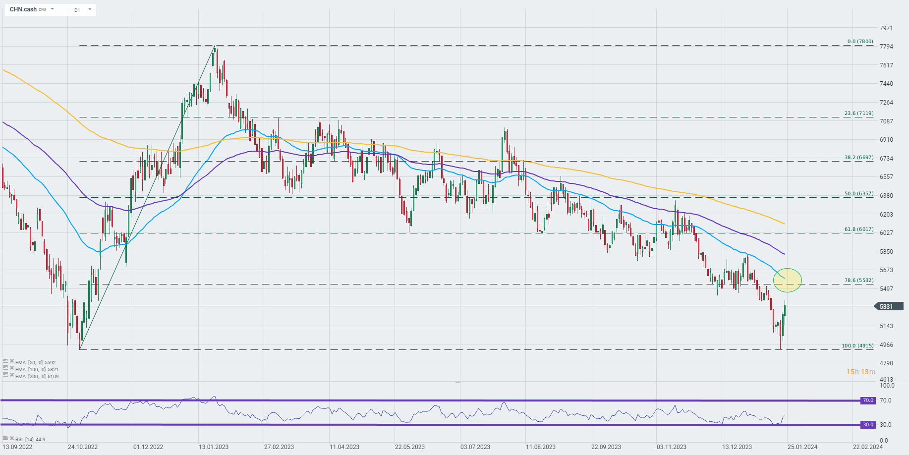 استمر انتعاش المؤشرات الصينية اليوم، مع مكاسب عملة CHN.Cash الصينية حاليًا بما يقرب من 2% على أساس يومي. هذه الزيادات هي في الأساس نتيجة لتراجع الانخفاضات الديناميكية الأخيرة والتعليقات الصادرة عن المؤسسة الصينية، التي أعلنت أنها تعتزم استخدام حوالي 300 مليار دولار من الحسابات الأجنبية للشركات المدرجة التي تسيطر عليها الدولة لدعم الوضع الصعب الحالي في سوق الأوراق المالية. بالإضافة إلى ذلك، من المتوقع أيضًا أن تستخدم الصين الأموال المحلية لشراء الأسهم التي تعاني من انخفاض شديد.