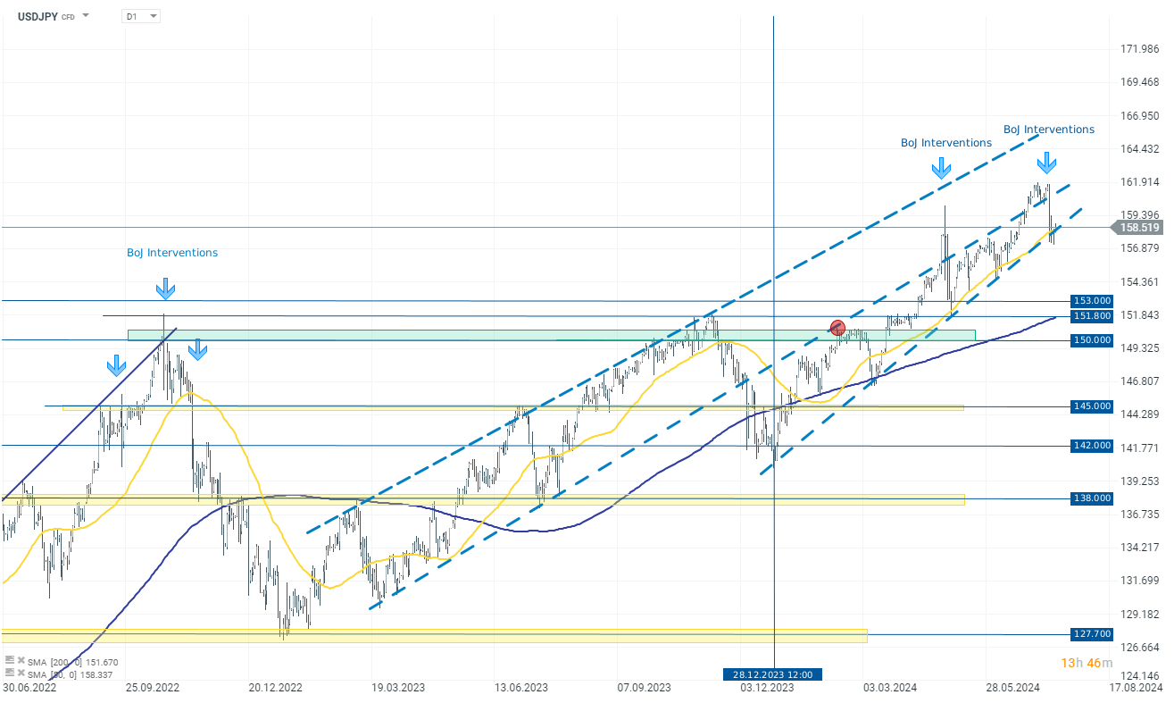 - بلغ تدخل بنك اليابان في الثاني عشر من يوليو/تموز ما يقرب من 22 مليار دولار، أو 3.5 تريليون ين، استناداً إلى مقارنة حسابات بنك اليابان وتوقعات سماسرة المال. ونتيجة لذلك، شهد الدولار الأميركي مقابل الين الياباني انخفاضًا بنسبة 2.80% إلى 157.5000.
