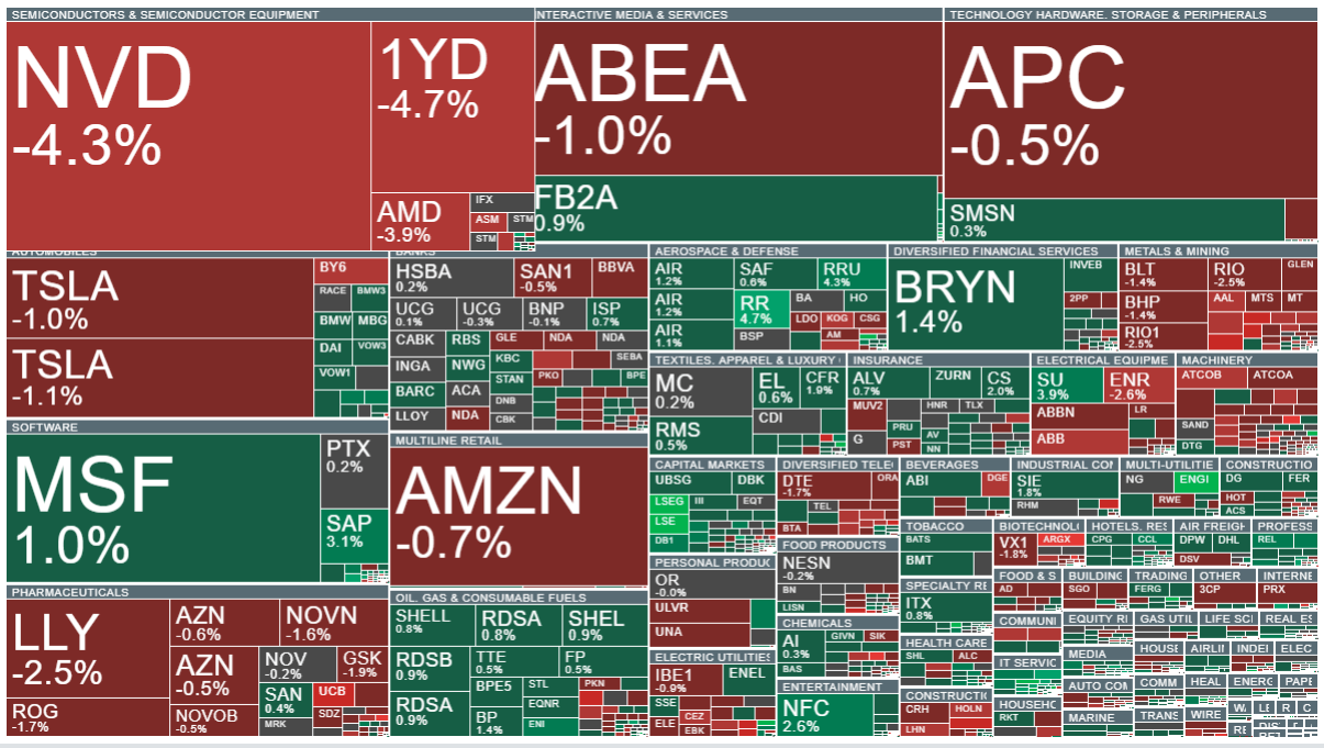 - وفي قطاع أشباه الموصلات، نشهد انخفاضات واسعة النطاق؛ حيث انخفضت أسهم إنفيديا بأكثر من 5.5%، بينما خسرت برودكوم ما يقرب من 6%. كما تتداول أسهم شركات التكنولوجيا الكبرى على انخفاض، باستثناء ميتا بلاتفورمز. وفي قطاع البرمجيات وخدمات تكنولوجيا المعلومات، تراجعت المكاسب الأولية. تراجعت أسهم شركة هايكو، المتخصصة في صناعة الطيران والدفاع، بأكثر من 10%، نتيجةً لتفاعل المستثمرين مع ارتفاع مستويات الديون وتراجع الربحية في قطاع مجموعة التقنيات الإلكترونية، على الرغم من نمو الإيرادات بنسبة 14% على أساس سنوي وتجاوز ربحية السهم للتوقعات.