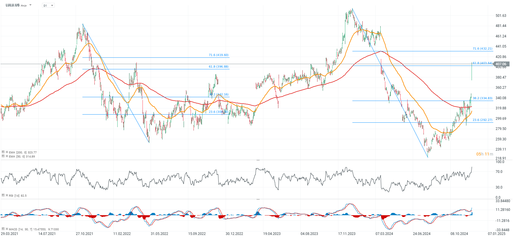 تتوقع لولوليمون أن يتراوح ربح السهم في الربع الرابع بين 5.56 دولار و5.64 دولار، وهو أقل من تقديرات 5.70 دولار. ورفعت شركة التجزئة إرشادات الإيرادات للعام بأكمله إلى ما بين 10.45 مليار دولار و10.49 مليار دولار، ارتفاعًا من 10.38 مليار دولار إلى 10.48 دولار سابقًا. بلغت أرباح السهم المتوقعة 14.08-14.16 دولارًا مقابل 13.95-14.15 دولارًا متوقعة سابقًا. ارتفعت الهوامش الإجمالية بمقدار 1.5 نقطة مئوية عند 58.5٪ مقابل 0.8 نقطة مئوية في الربع الثاني من عام 2024. وافقت الشركة على برنامج إعادة شراء بقيمة مليار دولار، والذي دخل حيز التنفيذ منذ 3 ديسمبر.