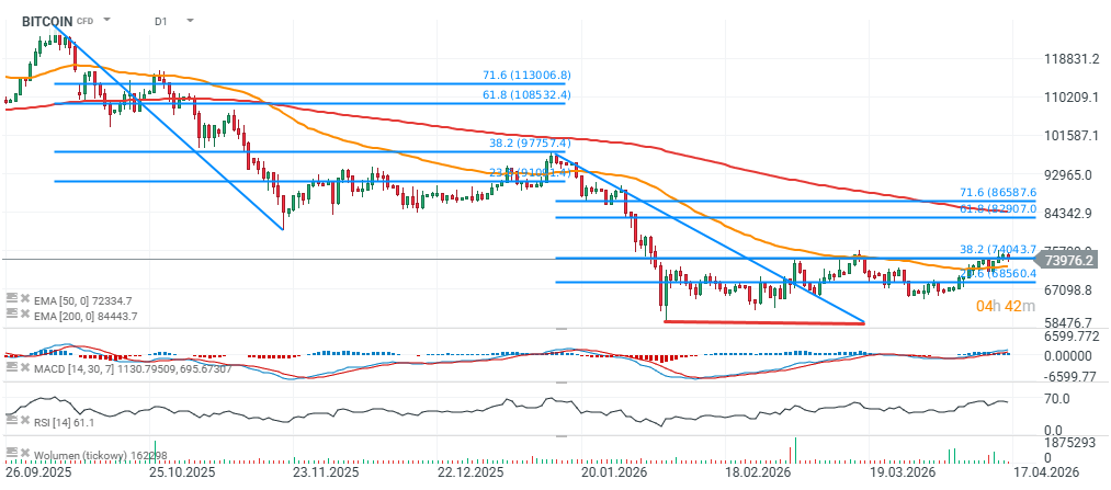وبالنظر إلى تصحيحات فيبوناتشي، نجد بعض أوجه التشابه بين الحركة الهبوطية الحالية والسابقة. عادت ضغوط البيع للظهور مجدداً حول مستوى تصحيح فيبوناتشي 38.2% لانخفاض يناير، تماماً كما مثّل هذا المستوى نقطة مقاومة رئيسية خلال الموجة الهبوطية السابقة التي بدأت في خريف 2025 وانتهت بانخفاض حاد بعد الارتداد قرب 97,700 دولار. حالياً، يبدو أن المنطقة بين 74,000 و75,000 دولار تلعب دوراً فنياً مشابهاً كمنطقة مقاومة رئيسية قد تؤدي إلى انهيار كبير نحو الأعلى أو موجة هبوطية قوية أخرى.