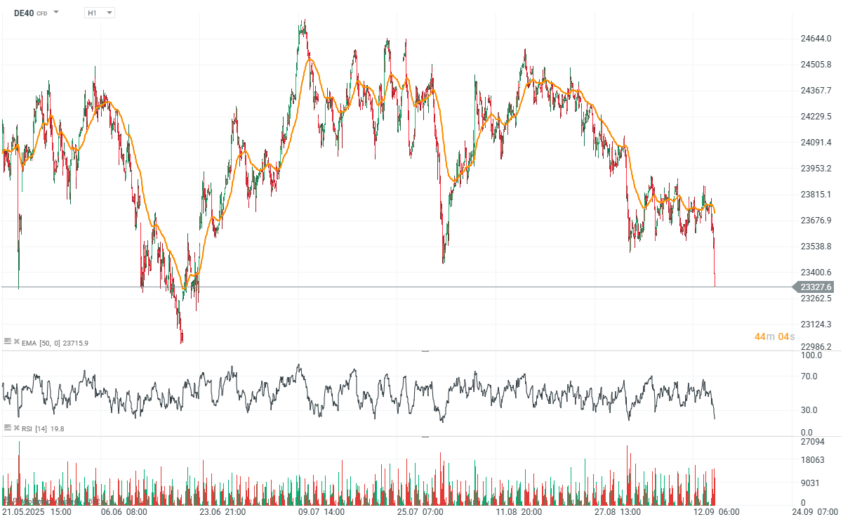 انخفضت العقود الآجلة لمؤشر الأسهم الألماني داكس (DE40) بأكثر من 1.8% اليوم، لتهبط إلى مستويات لم تشهدها منذ النصف الثاني من يونيو 2025. يشير مؤشر القوة النسبية (RSI) إلى استسلام، حيث انخفض إلى ما دون مستوى 20. وتقود شركات التأمين والبنوك الألمانية موجة البيع. حتى سهم راينميتال (RHM.DE) انخفض بنحو 1% اليوم، على الرغم من توصية بنك أوف أمريكا "بالشراء"، مشيرًا إلى استحواذ بحري بسعر مستهدف