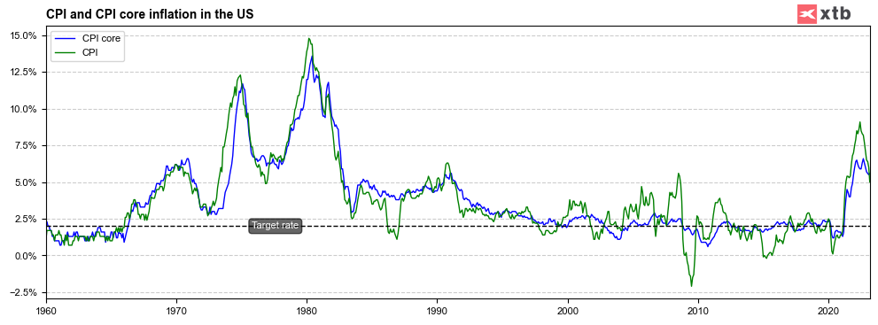 تباطأ التضخم الرئيسي لمؤشر أسعار المستهلكين في الولايات المتحدة إلى ما دون وتيرة التضخم الأساسي لمؤشر أسعار المستهلكين الأمريكي في مارس. المصدر: XTB، Bloomberg