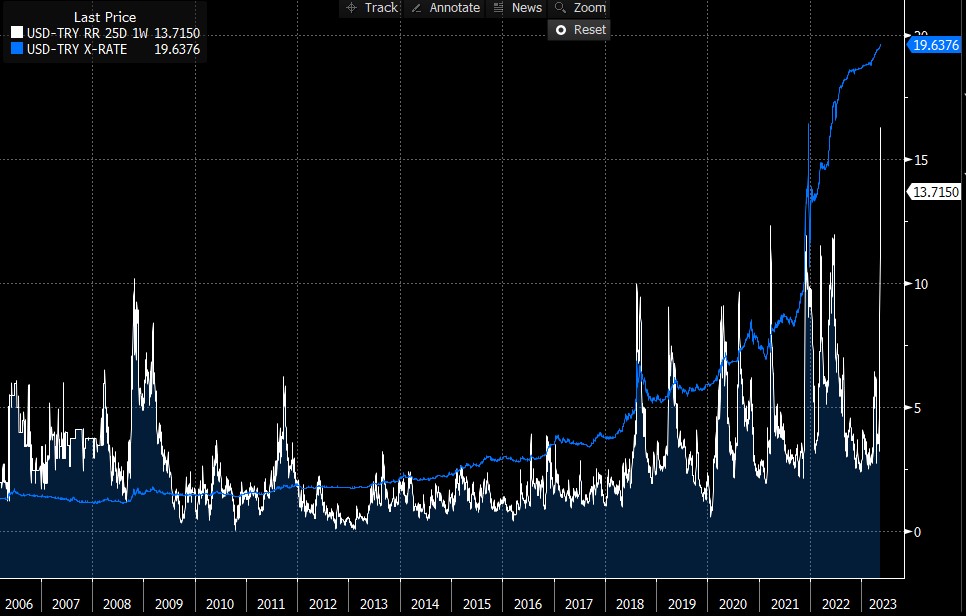 بالنظر إلى سلوك سوق الخيارات ، يرى السوق تقلبات هائلة محتملة في الأسبوع المقبل. تم تداول انعكاس المخاطرة الأسبوعي بالقرب من المستوى 15 ، وهي أعلى قراءة مسجلة ، مما يدل على مدى قوة السوق في التحوط ضد ارتفاع محتمل في الليرة. في الوقت نفسه ، قد يؤدي فوز المعارضة إلى تعزيز الليرة بشكل كبير. فقدت الليرة ما يقرب من 50٪ من قيمتها منذ بداية عام 2022.