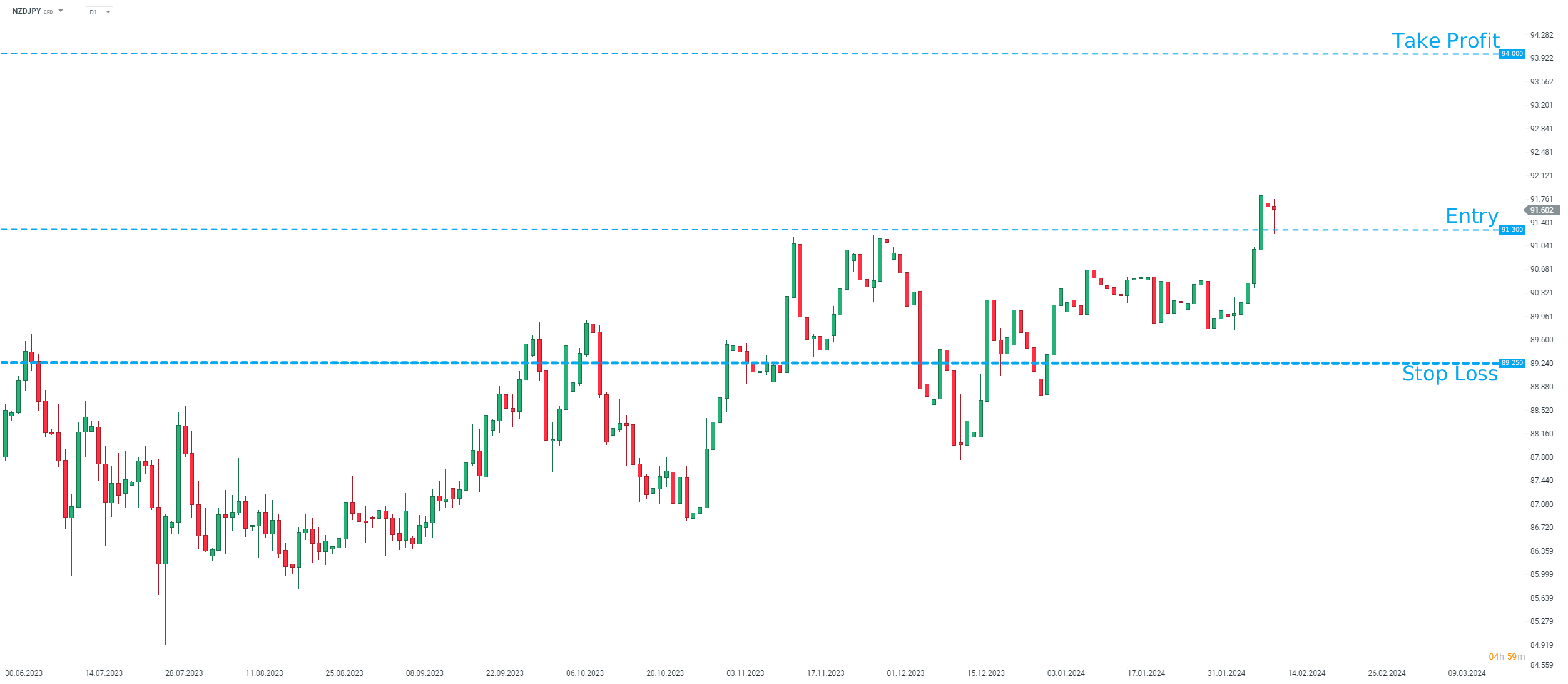ANZ recommends taking a long position on NZDJPY at market price with a target of 94.00 and a stop loss order placed at 89.25. Source: xStation5