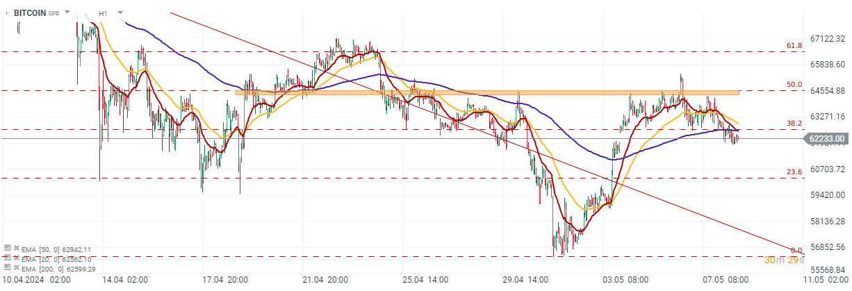 شهدت عملة البيتكوين تصحيحًا صعوديًا محليًا مؤخرًا. بالنظر إلى الفاصل الزمني H4، يمكن أن نرى أن البائعين تمكنوا من وقف التقدم عند منطقة المقاومة الرئيسية قصيرة المدى عند 64,230-64,600 دولار والتي تتميز بالحد الأعلى للهيكل 1:1، وتصحيح فيبوناتشي 50٪، وردود فعل الأسعار السابقة. بالإضافة إلى ذلك، ظهر نمط الشموع الهبوطية - الابتلاع الهبوطي على الرسم البياني. ومع أخذ ذلك في الاعتبار، فمن الممكن استمرار الحركة الهبوطية.
