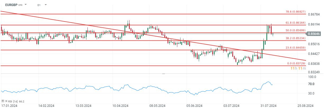 سجل زوج اليورو/الجنيه الإسترليني أقوى ارتفاع ديناميكي منذ سبتمبر 2022، من حيث الديناميكيات التي يحسبها مؤشر القوة النسبية على الفاصل الزمني D1. علاوة على ذلك، يشير سوق المال إلى أن بنك إنجلترا سيحافظ على موقف أكثر تحفظًا تجاه السياسة النقدية، وهو ما من شأنه أن يعزز الجنيه الإسترليني على المدى الطويل. ومن المتوقع أن يخفض بنك إنجلترا أسعار الفائدة بإجمالي 55 نقطة أساس على مدى الستين يومًا القادمة، مقارنة بـ 79 نقطة أساس للبنك المركزي الأوروبي. تبلغ أسعار منطقة اليورو حاليًا 3.75٪، بينما تبلغ أسعار الفائدة في المملكة المتحدة 5.00٪.