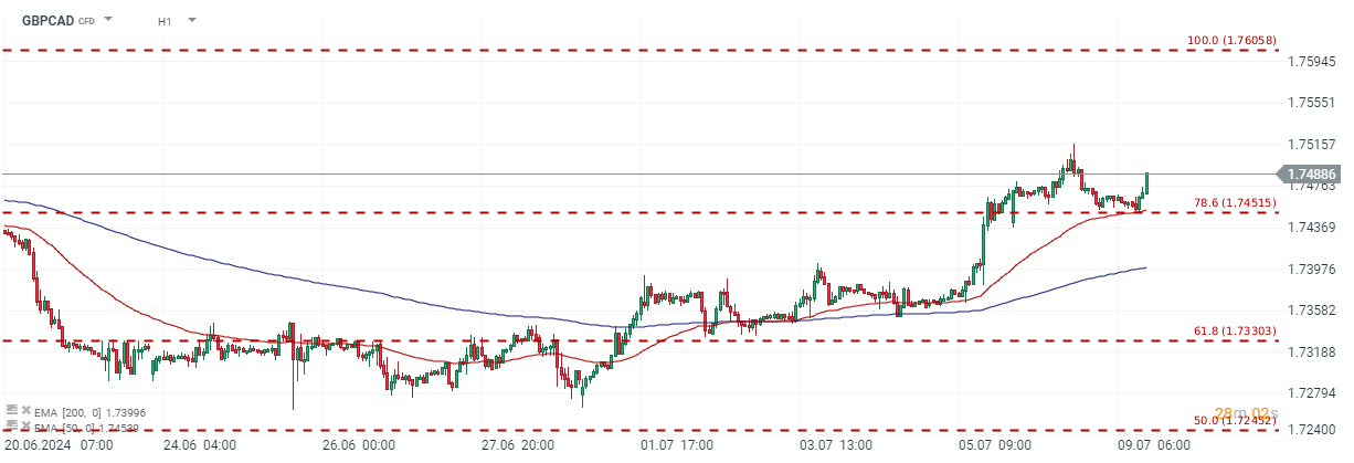 بالنظر إلى مخطط GBPCAD، يمكن أن نلاحظ أن السعر ارتد من مستوى الدعم الفني الرئيسي. يتميز هذا الدعم بالحد الأدنى للهيكل 1:1 (المستطيلات الحمراء)، بالإضافة إلى مستوى تصحيح فيبوناتشي 23.6%. بالإضافة إلى ذلك، يقع السعر فوق المتوسط المتحرك لمدة 100 فترة. إذا تمكن المشترون من الحفاظ على السعر فوق مستوى الدعم 1.7456، فقد تبدأ موجة صعودية أخرى.