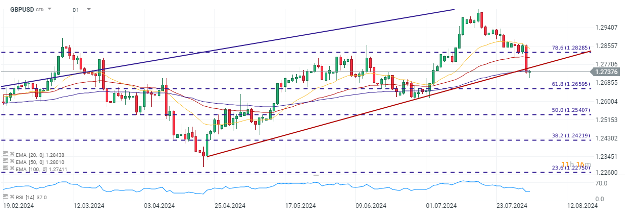 ارتفع الجنيه الإسترليني في يوليو بسبب إزالة المخاطر المرتبطة بالانتخابات العامة. وضعت صناديق المضاربة بشكل كبير على الجنيه الإسترليني لقرارات بنك إنجلترا المتشددة المحتملة. قرر بنك إنجلترا خفض أسعار الفائدة، للمرة الأولى منذ أربع سنوات، وألمح إلى دورة من التخفيضات. يخرج زوج الجنيه الإسترليني مقابل الدولار الأميركي من اتجاه صاعد كان قائماً منذ أبريل. تشير الموسمية (بناءً في المقام الأول على انخفاض حاد من العام الماضي) إلى أن الجنيه الإسترليني من المتوقع أن يضعف في أغسطس. قد يشير العدد المرتفع للغاية للمراكز الطويلة إلى خطر إغلاق هذه المراكز، مما قد يضغط على الجنيه الإسترليني. يجب أن نضع في اعتبارنا أن إصدار بيانات NFP اليوم قد يؤدي إلى تقلبات كبيرة في الدولار. وبالتالي، هناك خطر من أن يرتد هذا الزوج إذا كانت البيانات الأمريكية غير مواتية.