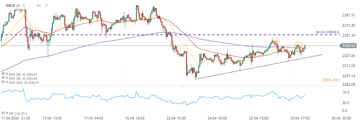 ارتفع الذهب منذ بداية الأسبوع الماضي بعد اختبار مستويات 2290$. أكمل الاتجاه الصعودي خلال تداولات الأسبوع مع بقاء المتحرك المتوسط ل 200 جلسة كمنطقة مقاومة مهمة. اختبر الذهب المتوسط المتحرك للمرة الثانية على التوالي صباح اليوم من دون تحقيق اختراق قوي.