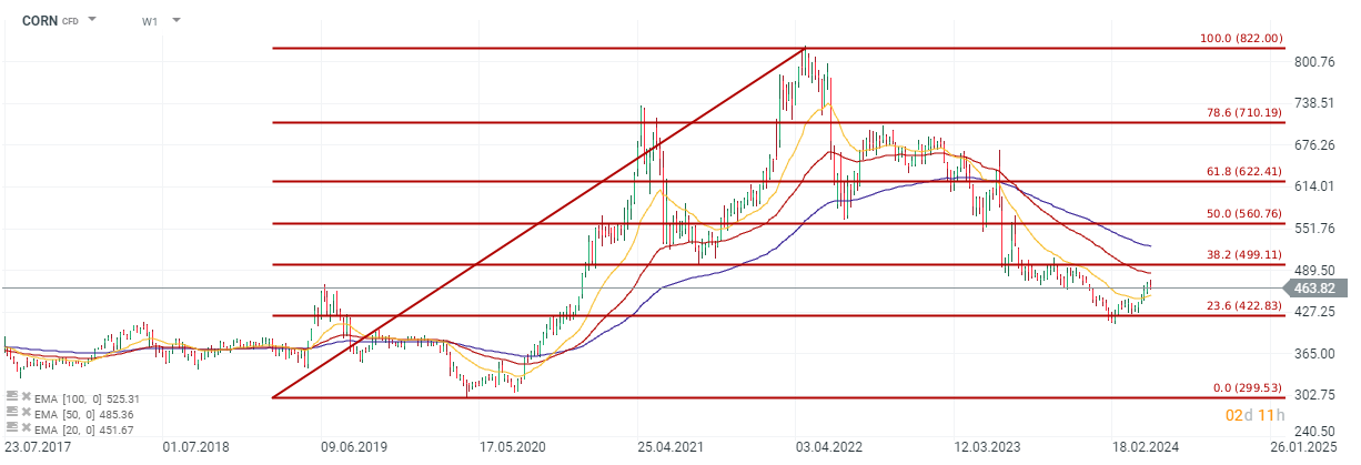 زراعة الذرة في الولايات المتحدة أقل من متوسط الخمس سنوات. يقوم المضاربون بتغطية صفقات البيع بقوة ويزيدون بشكل معتدل من صفقات الشراء. وقد انتعش صافي المراكز من أدنى مستوى له، والذي أشار تاريخياً إلى تحرك بنسبة 20-30٪ على الأقل. ويبلغ ارتداد السعر الحالي من أدنى مستوياته في فبراير حوالي 13٪. فالإنتاج البرازيلي أقل بقليل من التوقعات، ولا يزال هناك قدر كبير من عدم اليقين بشأن الإنتاج الأمريكي وصادرات الذرة الأوكرانية. ويشير الارتفاع القوي في أسعار القمح إلى أنه إذا حدثت مشاكل مماثلة في إمدادات الذرة، فقد يكون الارتفاع مماثلا.