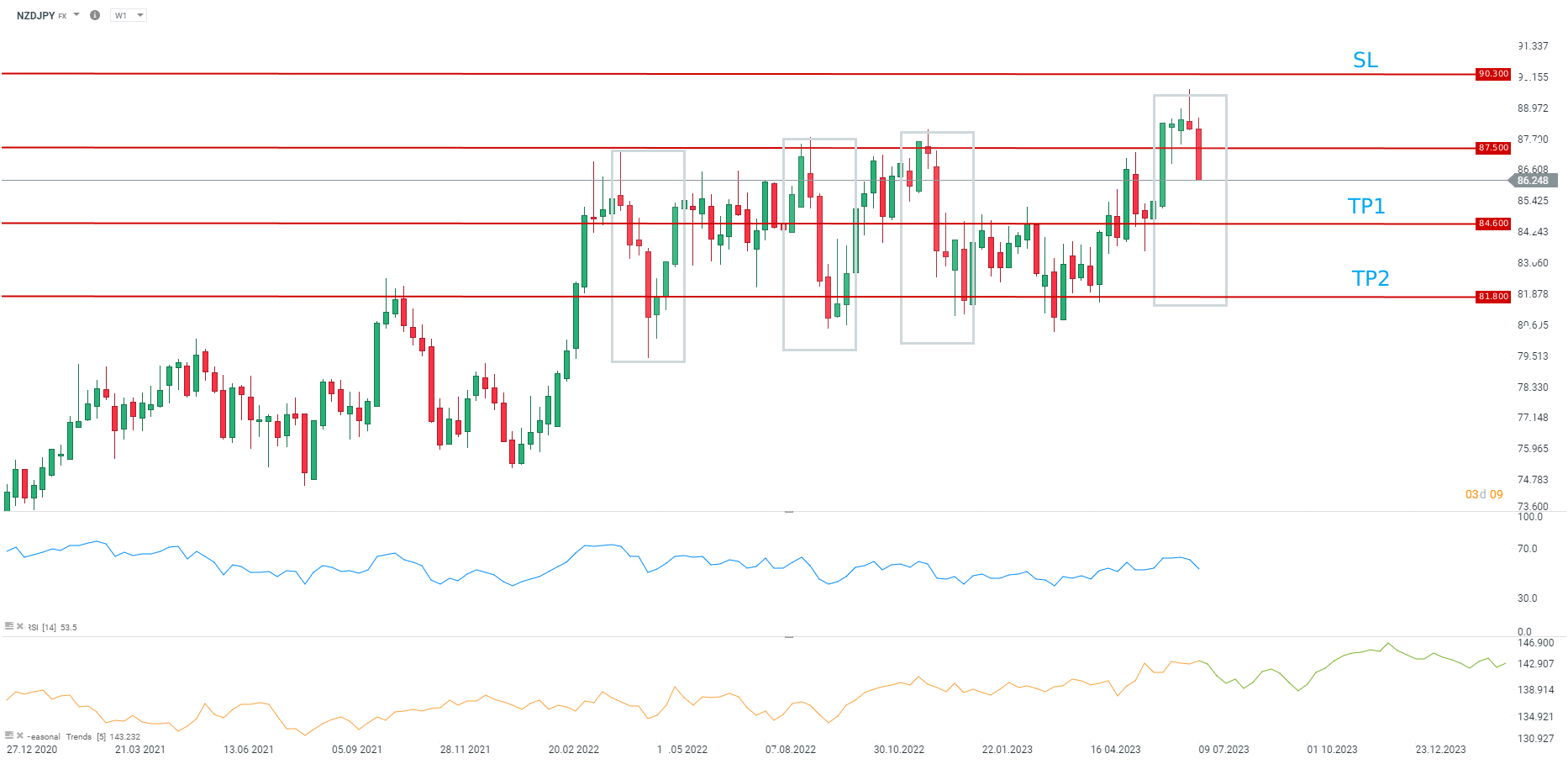 أبقى بنك الاحتياطي النيوزيلندي أسعار الفائدة دون تغيير والتي كانت في الواقع نهاية دورة التضييق وقد تم الإعلان عنها بوضوح سابقًا وتوقعها الأسواق. من ناحية أخرى، تتزايد فرص تغيير الاتجاه في السياسة النقدية في اليابان بقوة منذ بداية العام ، خاصة عندما ننظر إلى بيانات الأجور. بلغ نمو الأجور في اليابان في مايو 2.5٪ على أساس سنوي، وهي ثاني أعلى قراءة في 5 سنوات. إذا استمر الاتجاه الصعودي في الأجور، فقد يقرر بنك اليابان تغيير الاتجاه في السياسة النقدية بشكل أسرع. بالنظر إلى الرسم البياني ، يمكننا أن نرى أن الزوج يتحرك داخل تماسك مع نطاق يبلغ حوالي 800 نقطة منذ أبريل 2022. ويشبه التراجع الحالي شكل نجمة المساء، والذي من شأنه أن يدفع الزوج إلى مستويات أدنى. يمكن لنطاق التكوين أن يجعل السعر أقل حتى من 82.