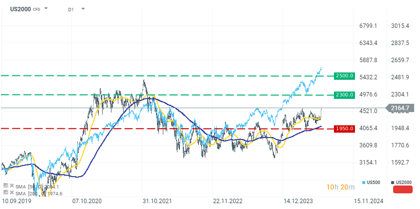 وعلى المدى الطويل، يظل الارتباط بين مؤشر US500 ومؤشر US2000 (راسل 2000) مرتفعًا للغاية. ومع ذلك، منذ بداية عام 2023 فصاعدًا، يمكننا أن نرى اختلافًا كبيرًا في الرسم البياني لكلا المؤشرين. من المؤكد أن أداء الشركات الكبيرة أفضل في بيئة أسعار الفائدة المرتفعة الأكثر تنافسية. علاوة على ذلك، تركز كل حماس المستثمرين حول الذكاء الاصطناعي على الأسهم ذات القيمة السوقية الكبيرة، التي كانت تمتلك المنتجات الأكثر تنافسية والأموال الاحتياطية لمزيد من الاستثمار.