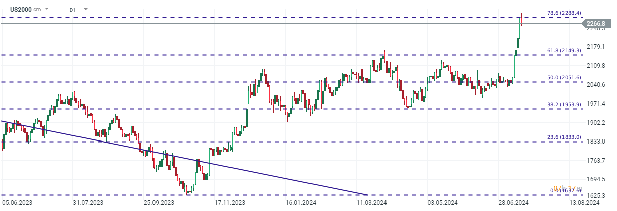 بالنظر إلى الفاصل الزمني D1، أوقف مؤشر US2000 الارتفاع الكبير الذي بدأ في يوم نشر بيانات مؤشر أسعار المستهلكين المنخفضة من الولايات المتحدة في منطقة تصحيح فيبوناتشي 78.6٪ للموجة الهبوطية التي بدأت في نهاية عام 2021. علاوة على ذلك، حجم الارتفاع الأخير كبير جدًا لدرجة أن مؤشر القوة النسبية للجلسات الـ 14 الماضية وصل إلى حاجز 83، مما قد يشير إلى أن هذا المؤشر قد يكون في منطقة ذروة الشراء على المدى القصير.