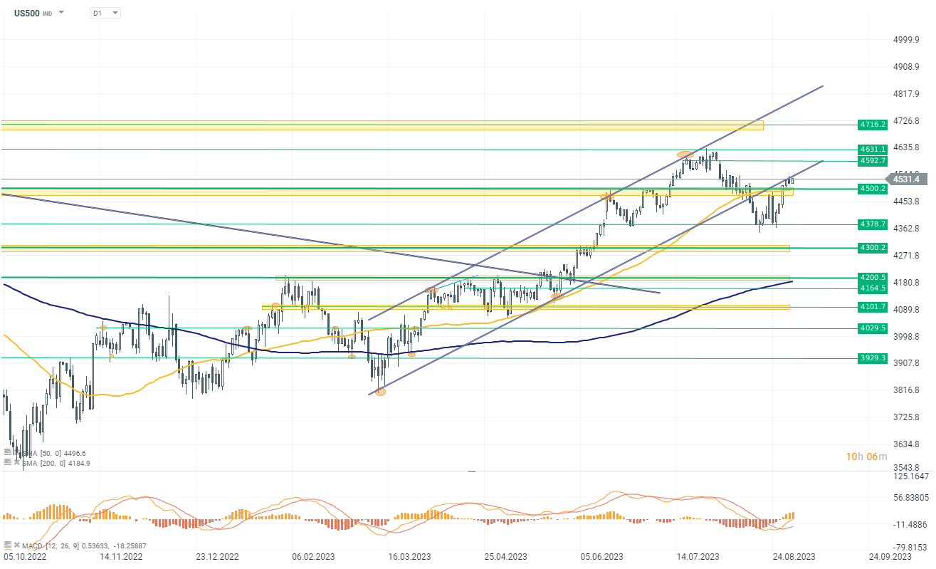 - عاد مؤشر US500 إلى المكاسب بعد التصحيح الأعمق الأخير، ليصل إلى أدنى مستوى محلي عند 4378 نقطة. اخترق السعر مستوى 4500 نقطة ولكنه لا يزال أدنى من خط الاتجاه الصعودي.